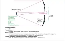 Было решено сделать первичное зеркало телескопа не цельным, а из складываемых сегментов, которые будут раскрыты на орбите, так как диаметр первичного зеркала не позволил бы его разместить в ракете-носителе «Ариан-5». Первичное зеркало телескопа «Джеймс Уэбб» является сегментированным и состоит из 18 шестиугольных сегментов, изготовленных из позолоченного бериллия, размер каждого из сегментов составляет 1,32 метра от ребра до ребра, которые вместе объединяются в одно зеркало общим диаметром 6,5 метра[16]. Это даёт телескопу площадь сбора света примерно в 5,6 раза больше, чем у зеркала телескопа Хаббл диаметром в 2,4 метра, с площадью собирающей поверхности 25,37 м² против 4,52 м² у Хаббла. В отличие от Хаббла, который ведёт наблюдения в ближнем ультрафиолетовом, видимом и ближнем инфракрасном (0,1—1,0 мкм) спектрах, телескоп «Джеймс Уэбб» будет вести наблюдения в более низком диапазоне частот, от длинноволнового видимого света (красный) до среднего инфракрасного (0,6—28,3 мкм). Это позволит ему наблюдать наиболее далёкие объекты во Вселенной, объекты с большим красным смещением (первые галактики и звёзды во Вселенной), которые слишком старые, слабые и далёкие для телескопа Хаббл[17][18]. Телескоп защищён 5-слойным тепловым экраном, позволяющим поддерживать температуру зеркала и приборов ниже 50 K (−223 °C), чтобы телескоп мог работать в инфракрасном диапазоне излучения и наблюдать слабые сигналы в инфракрасном диапазоне без помех от любых других источников тепла. Поэтому телескоп будет размещён на гало-орбите в точке Лагранжа L2 системы Солнце — Земля, в 1,5 млн км от Земли, где его 5-слойный тепловой экран, в форме воздушного змея и размером с теннисный корт, будет защищать от нагревания Солнцем, Землёй и Луной одновременно[19][20]. Размещение телескопа в космосе даёт возможность регистрировать электромагнитное излучение в диапазонах, в которых земная атмосфера непрозрачна; в первую очередь — в инфракрасном диапазоне. Благодаря отсутствию влияния атмосферы разрешающая способность телескопа в 7—10 раз больше, чем у аналогичного телескопа, расположенного на Земле.