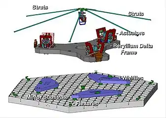 - Сегменты выполнены в технологии адаптивной оптики, то есть не жёсткими, а «полужёсткими» и микромеханика позволяет корректировать кривизну зеркала для исправления ошибок сочленения или неправильной позиции зеркала