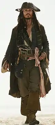 Депп сотрудничал с костюмером Пенни Роуз во время работы над внешностью персонажа, готовя треугольную шляпу как знак Джека Воробья — ни одному персонажу в серии фильмов нельзя было носить треугольную шляпу, это делало Джека уникальным. В сцене, где шляпа падает в воду, была использована резиновая версия[43]. Деппу нравилось носить один и тот же костюм всю серию, особенно легкий твидовый пиджак[44], и он должен был носить сапоги без носка или пятки в сценах на пляже[45]. Ни один из костюмов во время «Проклятия Чёрной Жемчужины» не сохранился, что дало возможность создать жесткие льняные рубашки для трюков[46][47]. Роуз было трудно найти создателей пояса Воробья в Турции[48]. Воробей носит дополнительный ремень в сиквелах, потому что Деппу понравилась новая пряжка, которая не подходила к первому поясу[49].