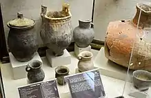 Городища были окружены могильниками, в которых совершались захоронения в кирпичных склепах, ямах, ямах с нишами, ямах с подбоями.[7] Также встречаются катакомбы. Среди находок – фибулы, ременная гарнитура, зеркала, янтарные и стеклянные бусы, антропо- и зооморфные фигурки и налепы на керамике, золотые украшения, резные иранские геммы (камни-печати), китайский, индийский и другой импорт[8].