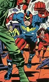 | Капитан Америка, Красный страж, Мисс Патриот, Мисс Америка, Волчок, Ангел, Дух 76-го, Красный ворон, Синий алмаз, Тонкий человек | |