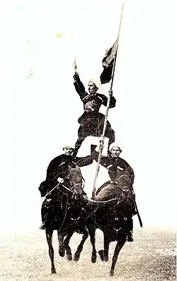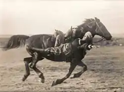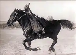 - На полном ходу соскакивание с лошади назад и в тот же момент вскакивание опять на лошадь сзади же, притянувшись за хвост