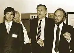 Тогда Джобс провёл презентацию Apple II в штаб-квартире Commodore. Во время выступления Джобс вёл себя настолько нагло и самоуверенно, что Возняк готов был сквозь землю провалиться от стыда. Руководство Commodore им отказало, но Джобс и не думал сдаваться. Он отправился обратно в Atari и предложил Бушнеллу вложить в проект 50 тысяч долларов в обмен на треть акций Apple. Снова отказ, о котором Бушнелл потом очень жалел. Из сочувствия Бушнелл посоветовал Джобсу обратиться к основателю одной из первых венчурных компаний Sequoia Capital Дону Валентайну, который раньше, будучи директором по маркетингу в National Semiconductor, занимался полупроводниками[79].