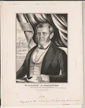 Уильям Фрим Джонстон (29 ноября 1808 — 25 октября 1872) — 11-й губернатор Пенсильвании с 1848 по 1852, юрист по образованию. Джонстон стал окружным прокурором в округе Уэстморлэнд в возрасте 21 года в 1829 году. Он был избран в Законодательное Собрание штата Пенсильвании и перешёл из Демократической партии к партии Вигов в 1847 году, чтобы баллотироваться в Сенат штата Пенсильвания.