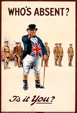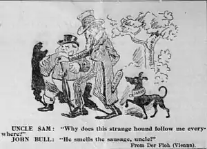 В этом его отличие (противоположность внешнего вида) от своего «родственника» американского дяди Сэма, обычно изображавшегося худым, долговязым, бледным, с тонкими вытянутыми хищными чертами лица, с козлиной бородкой, дельцом в синей ливрее и высоком узком цилиндре.