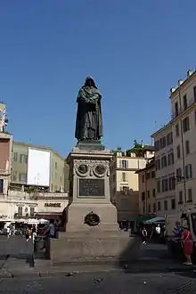 Джорда́но Бру́но (итал. Giordano Bruno, лат. Iordanus Brunus; урождённый Филиппо Бруно[6], по месту рождения имел прозвище Ноланец, лат. Nolanus; 1548, Нола близ Неаполя — 17 февраля 1600, Рим) — итальянский монах-доминиканец, философ-пантеист и поэт; автор многочисленных трактатов[7]. Представитель эзотеризма[8] и герметического оккультизма[9]. Из-за своей склонности к чтению сочинений, считавшихся католической церковью подозрительными, и по причине высказываемых сомнений относительно пресуществления и непорочного зачатия Девы Марии, а также своего неортодоксального подхода к трактованию Троицы навлёк на себя подозрения в ереси и был вынужден покинуть орден доминиканцев (1576) и скитаться по Европе: жил в Швейцарии, Франции, Англии и Германии[8][10]. Вернувшись в Италию (1592), был арестован в Венеции и выдан инквизиционному суду в Риме. Он отказался отречься от своих учений и после семилетнего тюремного заключения был сожжён на костре как еретик и нарушитель монашеского обета[7]. В 1889 году на месте казни в Риме ему был воздвигнут памятник.