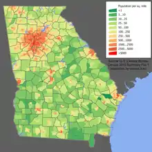 По данным переписи 2020 года, население Джорджии составляет 10 725 274 человек[1]. Согласно переписи, белые американцы составляют около 65 % населения штата, афроамериканцы — 29,6 %, лица азиатского происхождения — 2,8 %[6]. На 2005 год 90 % населения Джорджии говорит дома только на английском, 5,6 % — говорит на испанском. Третий по распространённости родной язык — французский (0,9 %), за ним немецкий (0,8 %) и вьетнамский (0,6 %).