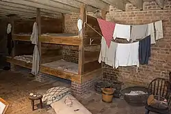 На центральной ферме (Mansion House Farm) рабы жили в основном в двухэтажных каркасных домах, которые назывались Quarters for Families. Эти здания в 1792 году были заменены на две кирпичные пристройки к основному зданию, в которых было четыре комнаты, каждая по 56 кв. метров. Это были предположительно общие комнаты в основном для мужчин, и в них почти не было личного пространства. Остальные рабы жили при тех зданиях, где они работали, или в бревенчатых домиках. Такие домики были типичным жильём для рабов на внешних фермах, и такие же домики строились на других плантациях Вирджинии, и беднейшие белые вирджинцы в окрестностях Чесапикского залива имели такие же жилищные условия[20]. В таком доме была одна комната, обычно площадью от 15.6 кв. метра до 23 кв. метров, на которой жила одна семья. Таким домики были обычно построены очень примитивно, обмазаны глиной для гидроизоляции и имели земляные полы. Некоторые такие домики можно было перемещать с места на место на повозках. Почти не осталось документов, описывающих условия жизни в этих домах, хотя один посетитель в 1798 году писал: «муж и жена спали на тонком настиле, а дети на земле; очень грубый очаг, несколько посудин для еды, но посреди этой бедности находились чашки и чайник». Из других свидетельств следует, что дома были тёмные, грязные, пропахшие дымом, с одним окном с ставнями и очагом для освещения в ночное время[21].