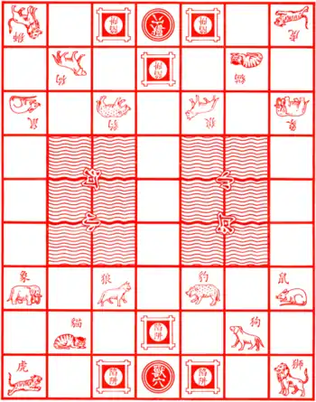 На доске есть несколько специальных областей и полей: Убежище (кит. упр. 獸穴, пиньинь shòuxuè, палл. шоусюэ, «звериное логово») находится в центре первого ряда или ранга доски и обозначено китайским иероглифом. Ловушки (кит. упр. 陷阱, пиньинь xiànjǐng, палл. сяньцзин, «волчья яма, ловушка, западня, капкан») находятся справа и слева от Убежища, а также перед ним, и тоже обозначены соответствующим китайским иероглифом. Две области с водой или Реки (кит. упр. 河川, пиньинь héchuān, палл. хэчуань) находятся в центре доски. Каждая Река имеет размер 2x3 поля, и обозначается китайским символом, обозначающим реку. Противоположные стороны игрового поля соединяются тремя колонками обычных «сухопутных» клеток — две из них по краям доски, одна — посередине между «реками».
