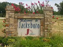 | Аптека в Джэксборо | Типичная картина пересечённой местности из пастбищ и покрытых лесами холмов на востоке округа | Знак приветствия на въезде в Джэксборо |