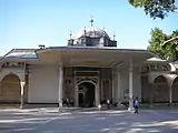 Султаны Османской империи использовали дворец Топкапы как свою королевскую резиденцию в течение 400 лет, с момента его постройки во второй половине 15 века. Второй двор дворца или Алай Мейданы использовался для официальных церемоний. В церемонии участвовали все значимые при дворе персоны. Трон ставился перед третьими воротами, Баб-ус-саадет (Ворота счастья), поскольку двор подходил для многолюдных собраний. Когда все собирались, новому султану сообщали, что все готово для проведении церемонии, и торжественно одетые гости окружали трон. Самые высокопоставленные улемы и визири ждали в зале совета, чтобы появляться оттуда по очереди. Затем султан входил из Баб-ус-саадет с кизляром-агой по правую руку и капы-агой — по левую. Прежде чем сесть на трон, султан приветствовал служителей дворца; сановники произносили формальное приветствие: «Пусть вы и ваше царство проживёте тысячу лет». В начале церемонии накиб аль-ашраф входил во двор, становился перед султаном и совершал молитву, затем новый султан поднимался, накиб аль-ашраф целовал ему руку, а дворцовые охранники аплодировали. После этого султан возвращался на трон, а накиб аль-ашраф — на своё место у сокровищницы. Один за другим члены двора приносили присягу на верность. Во время приветствий, чтобы не допустить путаницы, члены совета сообщали султану, когда стоять и сидеть, произнося: «Мой султан, вы можете встать» или «Мой султан, вы можете отдохнуть»[1].