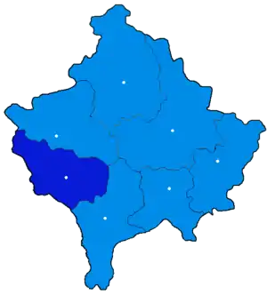 Этот округ включает три общины, которые по административному делению Сербии находятся в других округах - общины Джяковица и Дечани входят в Печский округ, а община Ораховац входит в Призренский округ.