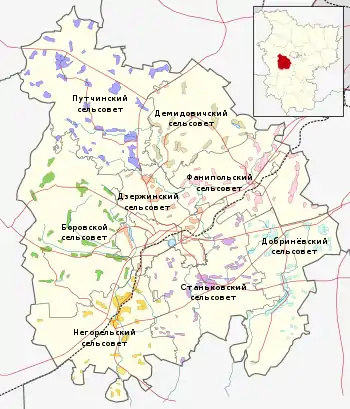 - до 30 октября 2009 года — 12 сельсоветов и 1 поссовет; до 28 мая 2013 года — 10 сельсоветов; город Дзержинск находится в прямом подчинении району, город Фаниполь имеет собственные органы местного управления и самоуправления.