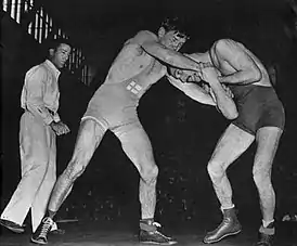 ![]() Роман Дзнеладзе (справа) в схватке с Рауно Мякиненом. Олимпиада в Мельбурне. 1956 год | |