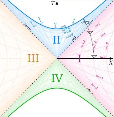Диаграмма Крускала–Секереша, проиллюстрированная для 2GM = 1. Квадранты - это внутренняя часть черной дыры (II), внутренняя часть белой дыры (IV) и две внешние области (I и III). Пунктирные линии под 45°, разделяющие эти четыре области, представляют собой горизонт событий. Более темные гиперболы, ограничивающие верх и низ диаграммы, являются физическими сингулярностями. Более светлые гиперболы представляют собой изолинии координат Шварцшильда r, а прямые линии, проходящие через начало координат, представляют изолинии координат Шварцшильда t.