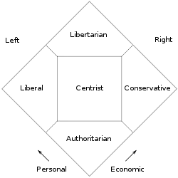Он считал, что практически все политические действия человека можно разделить на две основные категории: экономические и личные. Поэтому по каждой из осей отложена степень влияния государства на эти две категории свобод. В зависимости от допускаемой степени как экономической, так и личной (политической и культурной) свободы, на диаграмме различаются несколько областей, относящиеся к традиционным политическим течениям: