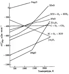 При высоких температурах кривая на диаграмме, соответствующая реакции 2C(тв) + O2(г) → 2CO(тв) уходит вниз и становится ниже всех кривых, соответствующих металлам. Следовательно, углерод может успешно использоваться в качестве восстановителя для всех оксидов металлов при очень высоких температурах. Однако при достаточно высокой температуре восстановленный хром реагирует с углеродом, образуя карбид хрома, что приводит к недостаточной чистоте и нежелательным свойствам получаемого металлического хрома. Поэтому для высокотемпературного восстановления оксида хрома углерод в качестве восстановителя не подходит.