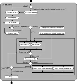 - Чёрный круг — начало процесса (начальный узел). Начальный узел деятельности (или начальное состояние деятельности) (activity initial node) является узлом управления, в котором начинается поток (или потоки) при вызове данной деятельности извне.