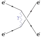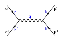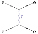 В более общем подходе квантовая электродинамика имеет дело с взаимодействиями между заряженными частицами (включая электроны и их античастицы — позитроны) и электромагнитным полем (векторами сил которого являются фотоны); на диаграммах Фейнмана электрон представлен стрелкой, направленной в направлении времени, позитрон — стрелкой, направленной в противоположном направлении, а фотон — волнистой линией[Note 7][29][30].