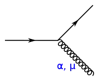 Изучение сильных взаимодействий с диаграммами Фейнмана возможно благодаря свойству асимптотической свободы, которое позволяет применять теорию возмущений к кваркам и глюонам: на очень коротком расстоянии это взаимодействие становится слабым[34][35]. Затем определяется константа связи сильного взаимодействия для вершины, отмечено как — это эквивалент постоянной тонкой структуры в квантовой электродинамике. Сложность квантовой хромодинамики связана с тем, что на кварки сильно влияют непертурбативные силы. Фиксируя на очень больших уровнях импульсов, где связь слабая, значение позволяет рассчитать результат процесса рассеяния при высоких энергиях[36].