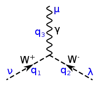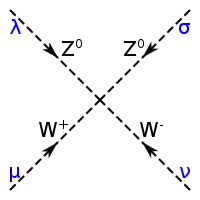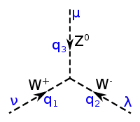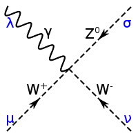 В слабом взаимодействии участвуют три его калибровочных бозона, W-бозон в двух его состояниях, и , а также бозон [37]. Эти переносчики обычно изображаются пунктирной или волнистой линией (такой же, как у фотона) с буквой соответствующего бозона. Прямая линия со стрелками продолжается здесь до кварков и других лептонов, с соответствующими им символами.