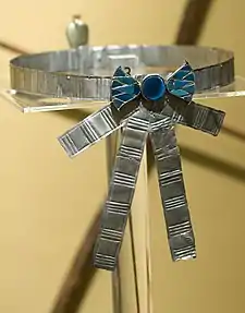 Золотая диадема. Греческий, вероятно, сделанный в Александрии, Египте, и принадлежащий дворянке династии Птолемеев (220—100 гг. до н. э.): застёжка имеет форму узла Геракла