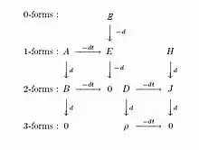 Профессор Georges A. Deschamps изобразил коммутативную диаграмму уравнений Максвелла в несколько другом виде, дополнив степенями дифференциальных форм от 0 до 3.[81][82] Можно проследить переходы в диаграмме Крона по диаграмме Deschamps и заметить что матрицы преобразований (соединений или граничные операторы) С и А используются как раз на границах подсистем. Например для связывания системы (ротора и статора в электродвигателе) через воздушные зазоры или границу раздела сред. Этих векторов (стрелок или операторов) перехода нет на диаграмме Deschamps, а уравнения, которые связаны с преобразованием системы содержат магнитную и диэлектрическую проницаемость и активное (волновое) сопротивление.