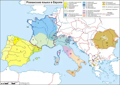 Романские языки в Европе. Западно-романские языки исторически представляют собой непрерывный диалектный континуум. На востоке коричневым цветом обозначен изолированный от них восточно-романский ареал