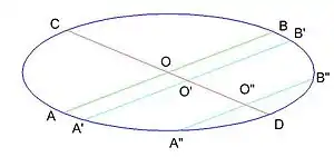 - Сопряжённые диаметры — диаметры, обладающие следующим свойством: середины хорд, параллельных первому диаметру, лежат на втором диаметре. В этом случае и середины хорд, параллельных второму диаметру, лежат на первом диаметре. Если эллипс является образом окружности при аффинном преобразовании, то его сопряжённые диаметры являются образами двух перпендикулярных диаметров этой окружности.