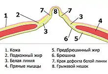 Прямые мышцы живота — это две вертикальные мышцы, расположенные между реберной дугой и лонной костью. Правая и левая прямые мышцы соединены между собой так называемой белой линией — тонкой и прочной сухожильной мембраной белого цвета (именно поэтому она и называется «белой линией»). Белый цвет ей придает большое количество прочного фибриллярного (волокнистого) белка коллагена и отсутствие мышечных волокон. Белая линия имеет наибольшую ширину в верхней части, и постепенно сужается книзу, где у некоторых людей она может даже отсутствовать ниже пупка, при этом правая и левая прямые мышцы могут вплотную соприкасаться между собой. По данным G. Beer, нормальная ширина белой линии на уровне мечевидного отростка составляет до 15 мм, на уровне 3 см выше пупка до 22 мм, и на уровне 2 см ниже пупка до 16 мм[2].