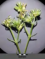 Цветки 1—2 мм в диаметре, 2—5 мм длиной, в верхушечных и пазушных дихазиях, сидячие или почти сидячие. Прицветники равны цветкам по длине или несколько длиннее. Чашечка из пяти (редко — четырёх) зелёных с беловатым краем чашелистиков 1,6—2 × 0,6—1 мм, треугольно-яйцевидной формы, острых. Лепестки отсутствуют. Тычинки в числе пяти, из которых функциональны обычно лишь две. Столбиков два, длина их 0,6—0,8 мм.