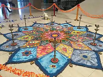 Одним из традиционных элементов декора праздника является ранголи — красочный рисунок-молитва, для создания которого используются цветной песок, подкрашенная рисовая вода и другие компоненты. Он представляет собой отражение природных мотивов и различных геометрических форм.
