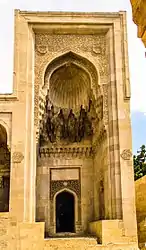 Портал главного входа увенчан сталактитовым полукуполом и богато украшен ковровой резьбой по камню необыкновенной красоты. Узор представляет собой сплетение листьев инжира и винограда, а надписи, сделанные на куфи, издалека кажутся сложным геометрическим орнаментом. К сожалению, строительство Диван-хане не было завершено. Художественная резьба по камню на портале и входах в «сени» и купольный зал являются шедеврами азербайджанского монументально-декоративного искусства.[12]