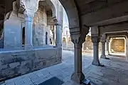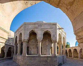 Дворик Диван-хане, с трёх сторон обрамлён стрельчатой аркадой. В композиционном центре Диван-хане на высоком стилобате стоит восьмигранная ротонда-павильон. Зал этой ротонды окружён открытой аркадой того же ордера. Эллиптическое покрытие со слегка заострённой макушкой защищено снаружи гранёным каменным куполом. Западный фасад ротонды выделен украшенным арабесками[16] порталом, каннелированный полукупол стрельчатой конхи которого опирается на систему тонко промоделированных сталактитов (мукарнасы). Тимпаны и надпроёмные плоскости покрыты орнаментом. Портал ведёт в сени, соединяющие зал с размещённым в стилобате склепом и служебными комнатами, расположенными одна над другой[17].