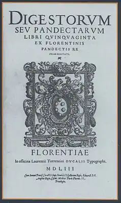- Digestorum seu Pandectarum libri quinquaginta ex Florentinis Pandectis repraesentati / Per Laelium Taurellium, edente ejus filio Francisco. — Florentiae, 1553. — Vol. 1—2.