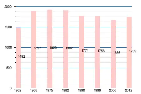 | 1962 | 1968 | 1975 | 1982 | 1990 | 1999 | 2005 | 2006 | 2010 | 2011 | 2012 |