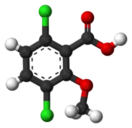 Дикамба, или 3,6-дихлор-2-метоксибензойная кислота представляет собой синтетический ауксин и используется в качестве гербицида. Разработан компанией Velsicol Chemical Corporation и впервые попал на рынок в 1965 году[2].