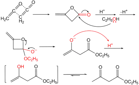 Дикетен является лактоном енольной формы ацетоуксусной кислоты и для него типичны реакции с нуклеофилами, протекающие с раскрытием лактонного цикла и ведущие к образованию производных ацетоуксусной кислоты: