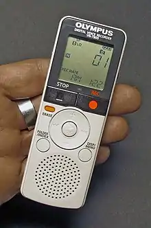 Диктофо́н (от лат. dicto — диктую и др.-греч. φωνή — звук) — устройство для записи, или для записи и воспроизведения устной речи с целью её последующего прослушивания и транскрибирования. В отличие от переносных репортёрских магнитофонов, предназначенных для качественной записи вне студии, диктофоны используют в случаях, когда необходимо записывать речь на протяжении длительного времени без особых требований к качеству записи — на лекциях и выступлениях, для фиксации телефонных разговоров и диспетчерских переговоров и т. п. Использование диктофона облегчает и ускоряет процедуру переноса устной речи на бумагу, позволяет отказаться от дорогостоящих услуг стенографов.