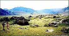 Среди них гигантские знаки ряби течения (см. рис. 1), дилювиальные валы-террасы (см. рис. 3) и дилювиальные бермы. Дилювий первых представлен преимущественно косослоистыми грубогалечнико-мелковалунными отложениями с крупным песком; дилювий вторых — хорошо промытыми, субгоризонально слоистыми дресвой, щебнем, гравелистым песком, куда «впаяны» без нарушения слоистости неокатанные эрратические валуны; дилювий третьих — «валунными мостовыми» и «каменными садами» (развалами огромных — до 12 м по длинной оси — глыб пёстрого петрографического состава) на поверхности аллювиальных и дилювиальных террас (рис. 4).