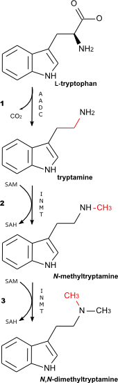 - Триптамин подвергается трансметилированию: фермент индоламин-N-метилтрансфераза (INMT) катализирует перенос метильной группы от кофактора S-аденозилметионин посредством нуклеофильной атаки аминогруппы триптамина. Эта реакция даёт промежуточный продукт N-метилтриптамин (NMT), и превращает S-аденозилметионин в S-аденозилгомоцистин (SAH).