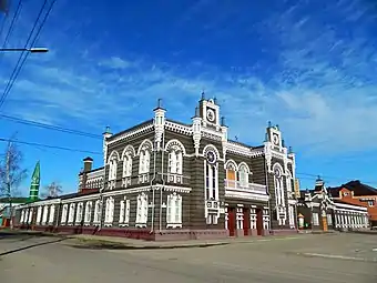 В 1908 году это здание как Народный дом было построено по ходатайству Посадской думы на средства посада Мелекесса, казны и частных пожертвований по проекту самарского архитектора Ивана Михайловича Крестникова (1872—1917)[4]. Здание построено в эклектическом архитектурном стиле, оно и сегодня не изменило внутренней планировки, сохранило свои внешние архитектурные формы. Двухэтажное краснокирпичное здание на невысоком цоколе, рельефной кладки, облицовано фигурным кирпичом. Фасад оформлен двумя ризалитами с готическими башенками на верхних прямоугольных выступах, с высокими узкими спаренными арочными окнами. Стены первого этажа прорезаны прямоугольными окнами, второго — арочными. Бывший Народный дом — одно из красивейших по архитектурному оформлению из сохранившихся историко-архитектурных памятников посада конца XIX — начала XX века.