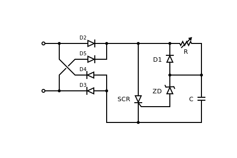 В первый момент времени тиристор SCR закрыт, а конденсатор C заряжается через резистор R. Напряжение входной полуволны нарастает, и в некоторый момент открывается динистор ZD, а за ним — и тиристор SCR. Между клеммами начинает проходить значительный ток. Ток течёт до тех пор, пока напряжение полуволны не снизится до закрытия динистора ZD. При этом конденсатор С разрядится через диод D1 и тиристор SCR. Тиристор закроется. На следующем цикле процесс повторится заново.