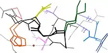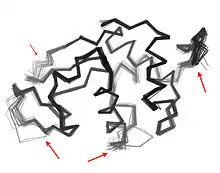 Это, пожалуй, наиболее очевидно для открытых петель, которые часто коллективно смещаются, принимая различные конформации в различных кристаллических структурах (см. рисунок). Однако сопряженная конформационная гетерогенность также иногда очевидна во вторичной структуре[9]. Например, последовательные остатки и остатки, смещенные на 4 в первичной последовательности, часто взаимодействуют в α-спиралях. Кроме того, остатки, смещенные на 2 в первичной последовательности, направляют свои боковые цепи к одной и той же стороне β-листов и достаточно близки для стерического взаимодействия, как и остатки на соседних нитях одного и того же β-листа. Некоторые из этих конформационных изменений индуцируются посттрансляционными модификациями структуры белка, такими как фосфорилирование и метилирование[9][10].