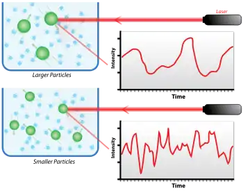 Динамическое рассеяние света используется в лазерной корреляционной спектроскопии для определения размеров частиц в суспензии. Размеры измеряемых частиц должны быть такого же порядка, что и длина волны рассеиваемого света. При прохождении пучка света через суспензию происходит его упругое (рэлеевское) рассеяние. В случае ДРС используют лазерное излучение, которое является когерентным и монохроматическим. Измеряемой величиной служит т. н. автокорреляционная функция (АКФ), определяемой по временному изменению интенсивности рассеиваемого излучения: , где — автокорреляционная функция, N- число измерений, выполняемых в момент времени , - интенсивность рассеивания света после определённого периода времени задержки .