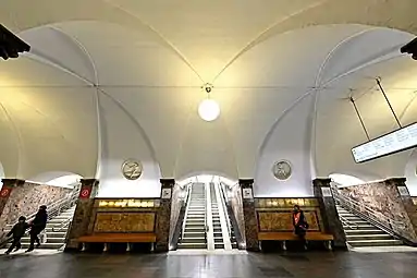 Конструкция станции — пилонная трёхсводчатая глубокого заложения[1] (глубина заложения — 40 метров[9]). Нефы станции отделены друг от друга, и главное объёмно-пространственное значение приобретает центральный зал[7]. Своды трёх залов станции опираются на мощные кубические пилоны с гладкими стенами в проходах и двумя выступами в продольных стенах залов. Пилоны облицованы уральским мрамором «Тагил»[8], отличающимся разнообразием рисунка, фактуры и большим количеством оттенков — от густо-красного до жемчужно-серого. Выступы пилонов увенчаны декоративными капителями[9]. На эти капители опираются стрельчатые распалубки нефов[7]. Поднимаясь вверх, распалубки пересекаются посередине сводов. В этих точках пересечения подвешены стеклянные шаровые люстры в бронзовой оправе[9].