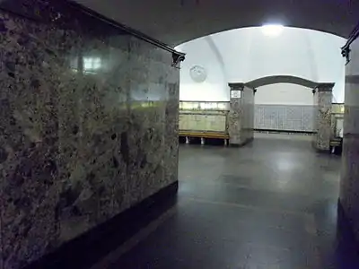 В отделке путевых стен использовались оникс, белый и серый мрамор; глухие стены станции отделаны мраморовидным известняком[1]. Боковые стены, расположенные над путями, облицованы серой керамической плиткой пирамидальной поверхности[9].