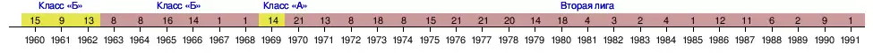 | 1969 | 14 (20) | 38 | 11 | 12 | 15 | 26—43 | 34 | Класс «А», II группа | Владимир Ведерников |