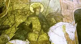 В Московском Кремле, на северной стене Тронного зала, изображена верхом на белом коне Святая царица Динара.