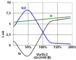 | Отрицательное внутреннее сопротивление наблюдается в тетродах тогда, когда с ростом анодного напряжения отток вторичных электронов с анода на экранирующую сетку растёт быстрее, чем ток первичных электронов, падающих на анод. На анодной вольт-амперной характеристике наблюдается нисходящий участок. С дальнейшим ростом анодного напряжения динатронный эффект ослабляется, и ток начинает вновь возрастать. Как правило, отрицательное внутреннее сопротивление крайне нежелательно, так как может порождать самовозбуждение усилителя. В пентодах динатронный эффект подавлен достаточно сильно, отрицательное внутреннее сопротивление не наблюдается. В лучевых тетродах оно может наблюдаться при больших отрицательных смещениях на управляющей сетке и малых токах анода, см. например ВАХ лучевого тетрода КТ88. | ![]() ВАХ триода Mullard 020 при Uc=+200В |